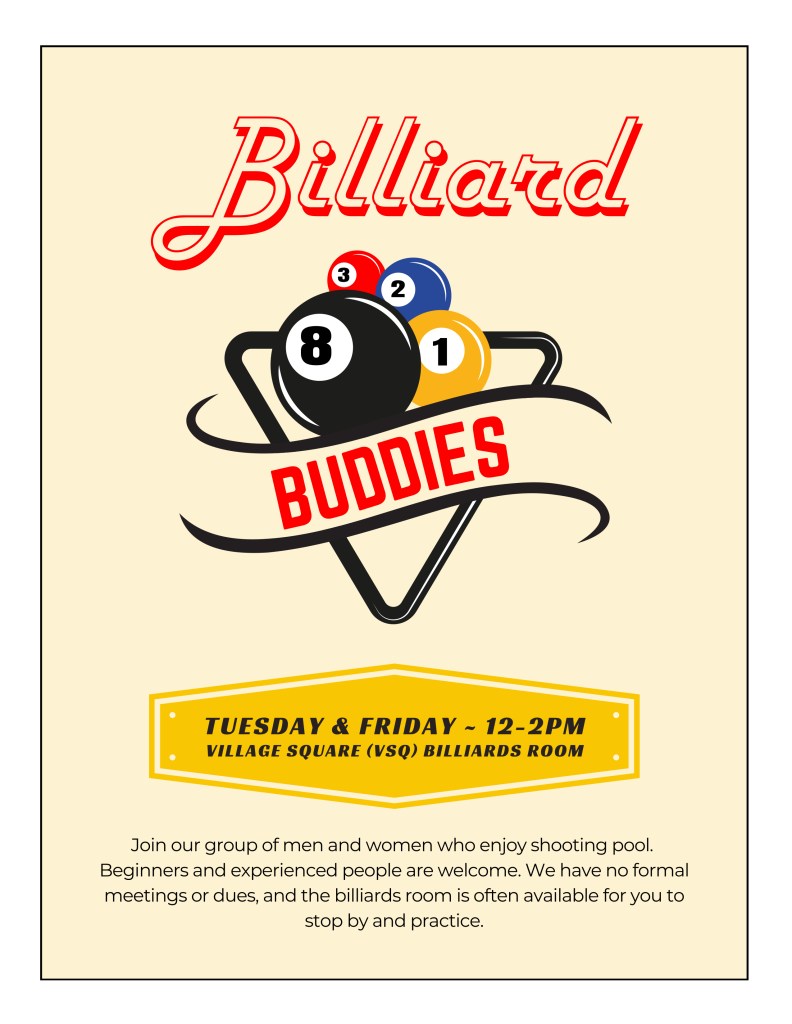 We play at the Village Square Billiards Room on Tuesdays and Fridays from 12:00 until 2:00 PM. Join our group of men and women who enjoy shooting pool. Beginners and experienced people are welcome. We have no formal meetings or dues and the Billiards Room is often available for you to stop by and practice.