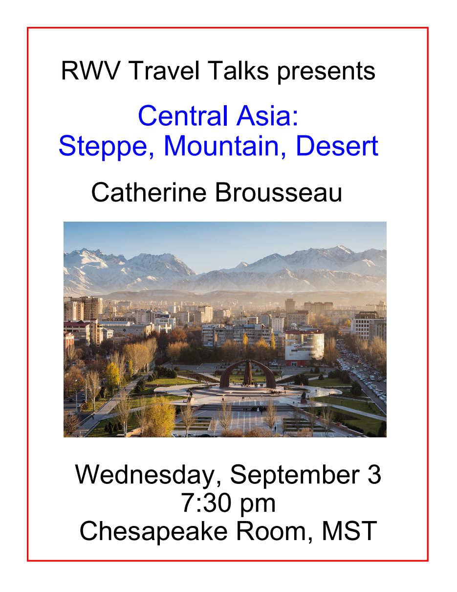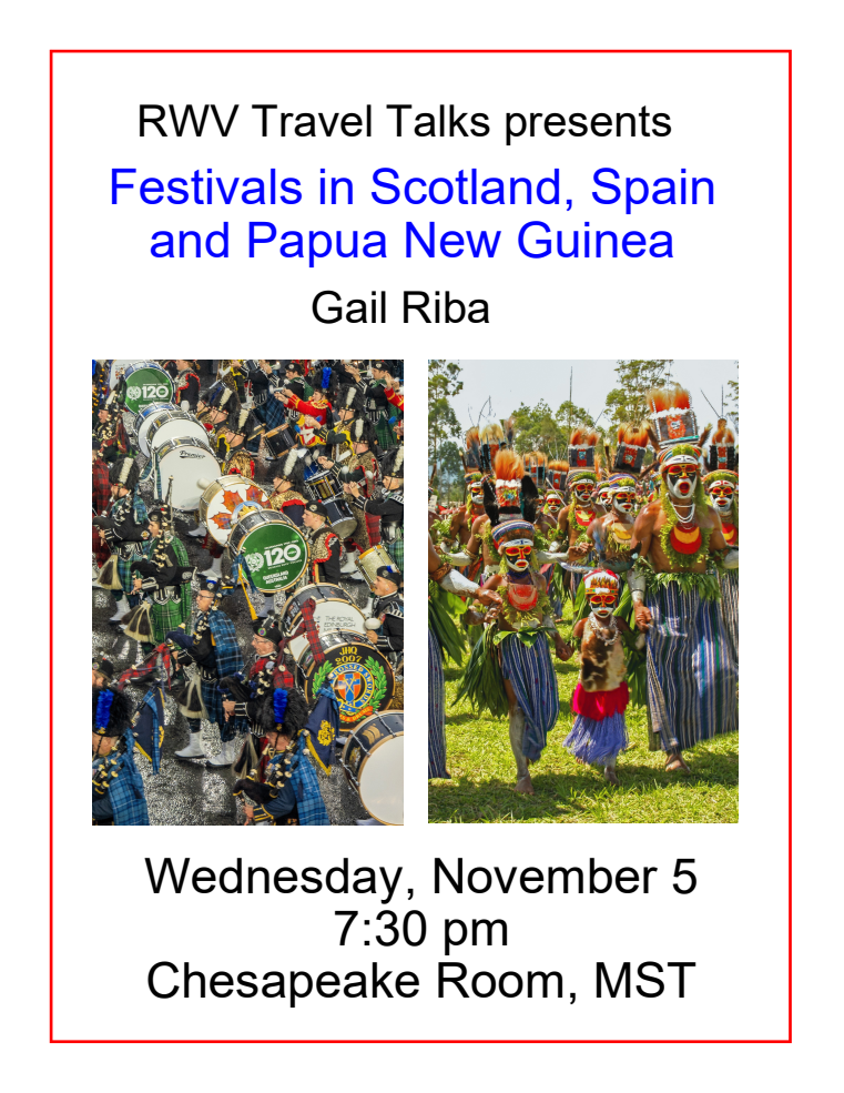 Travel Talks sponsors a monthly series of travelogues presented by Riderwood residents who have traveled extensively and taken high-quality photographs during their travels. Our presenters look forward to sharing their experiences with the audience, and are available for comments or questions following the presentation. Travel Talks are ordinarily held in the MST Chesapeake Room at 7:30PM on the first Wednesday of the month, September through June. Additional resident presenters are welcome, and if you would like to share a travel experience or obtain additional information about our group, contact Allen Minton at traveltalks@riderwoodlife.